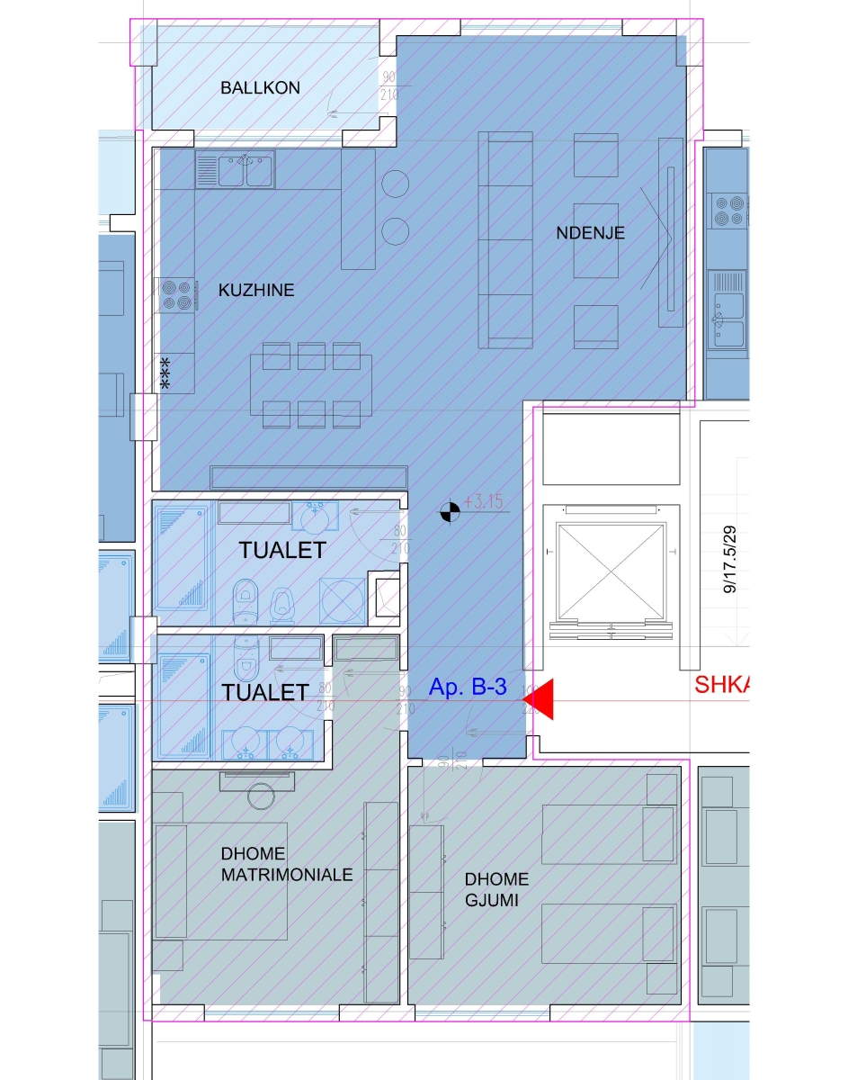 Apartamenti B-3 ndodhet në katin e parë të palacinës. Ai është i organizuar në 2+1, ku përfshin një dhomë matrimoniale bashkë me tualetin, një dhomë gjumi, një tualet, dhomë ndenjen kuzhinë dhe ngrënie me pamje nga oborri.
